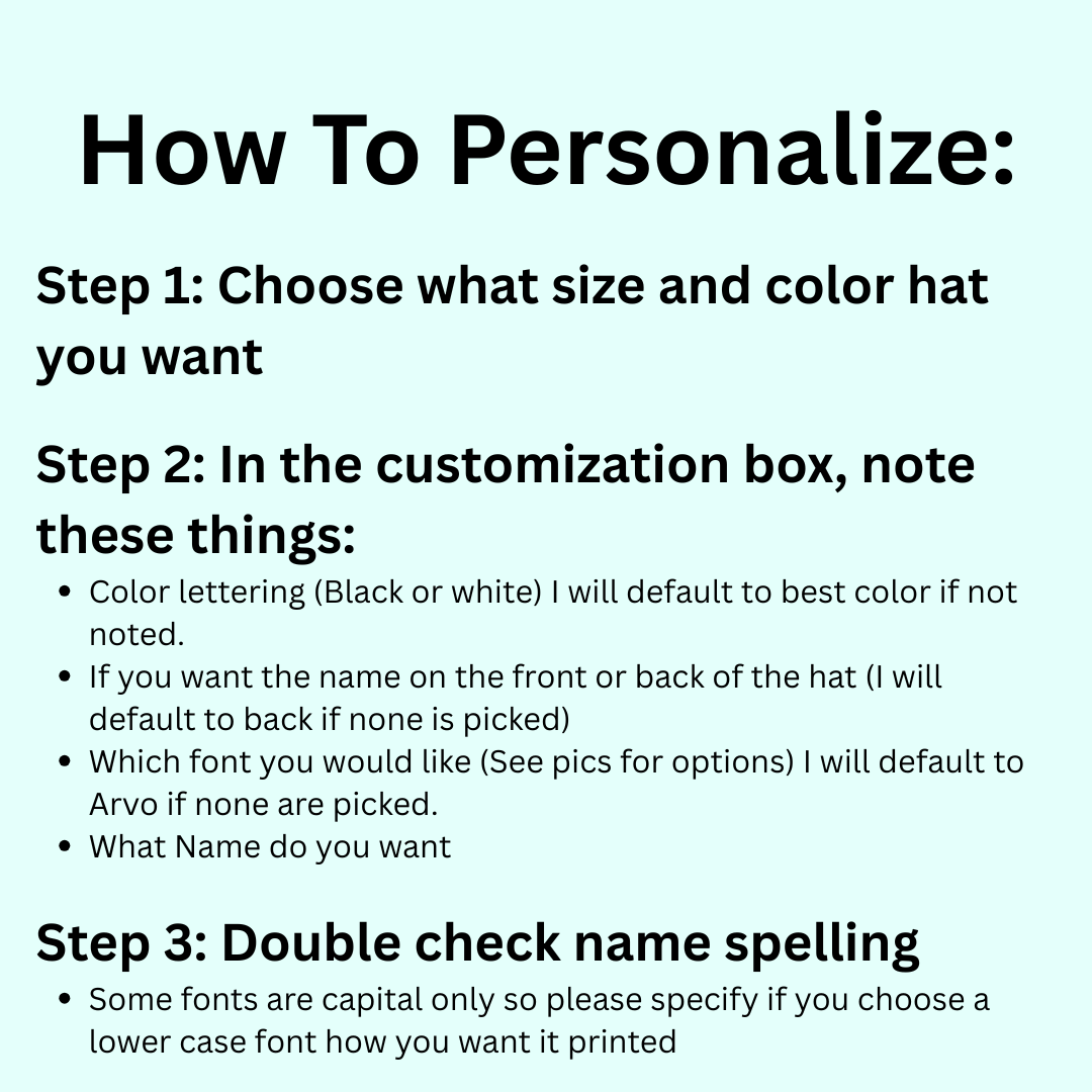 - If you want the name on the front or back of the hat (I will default to back if none is picked)