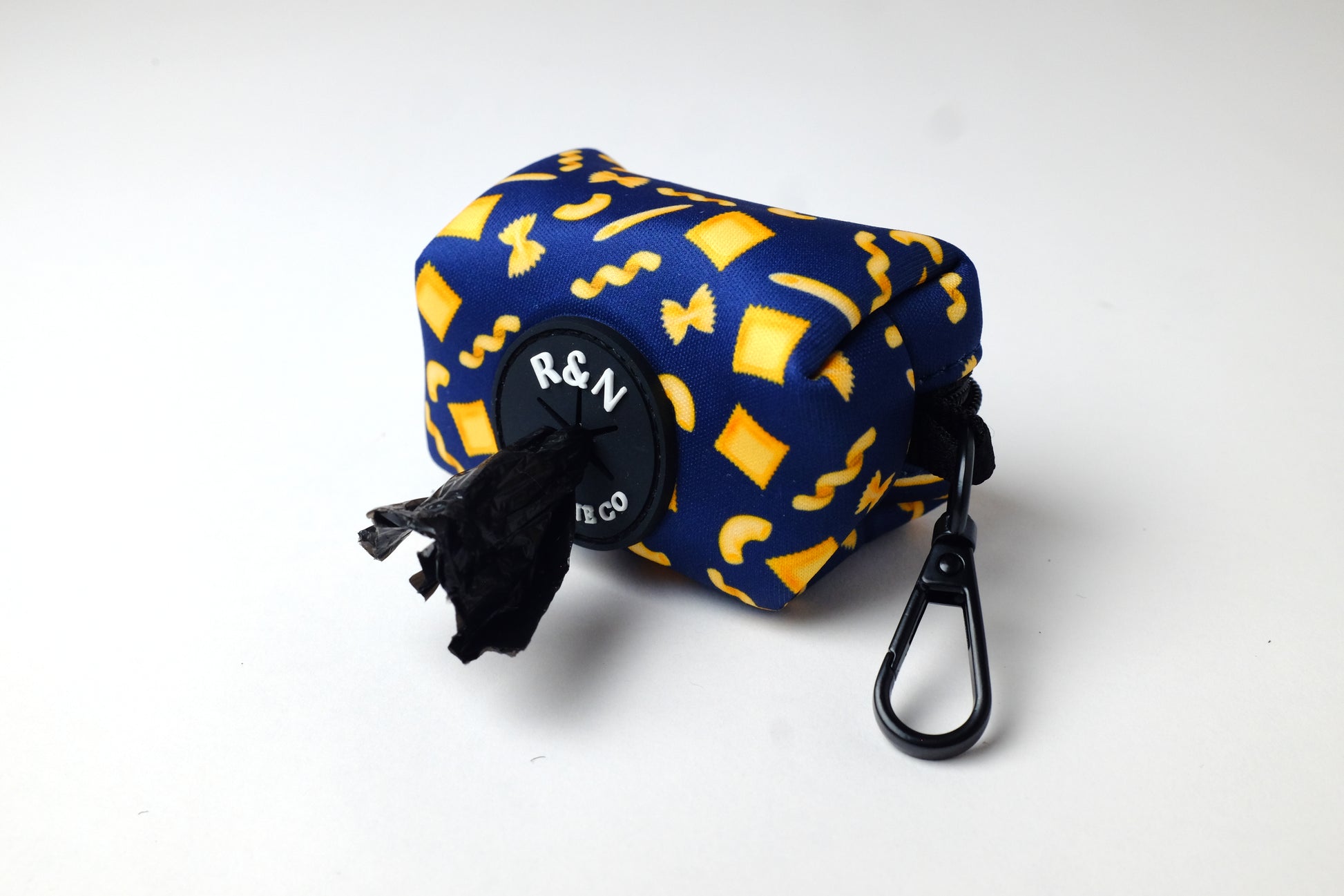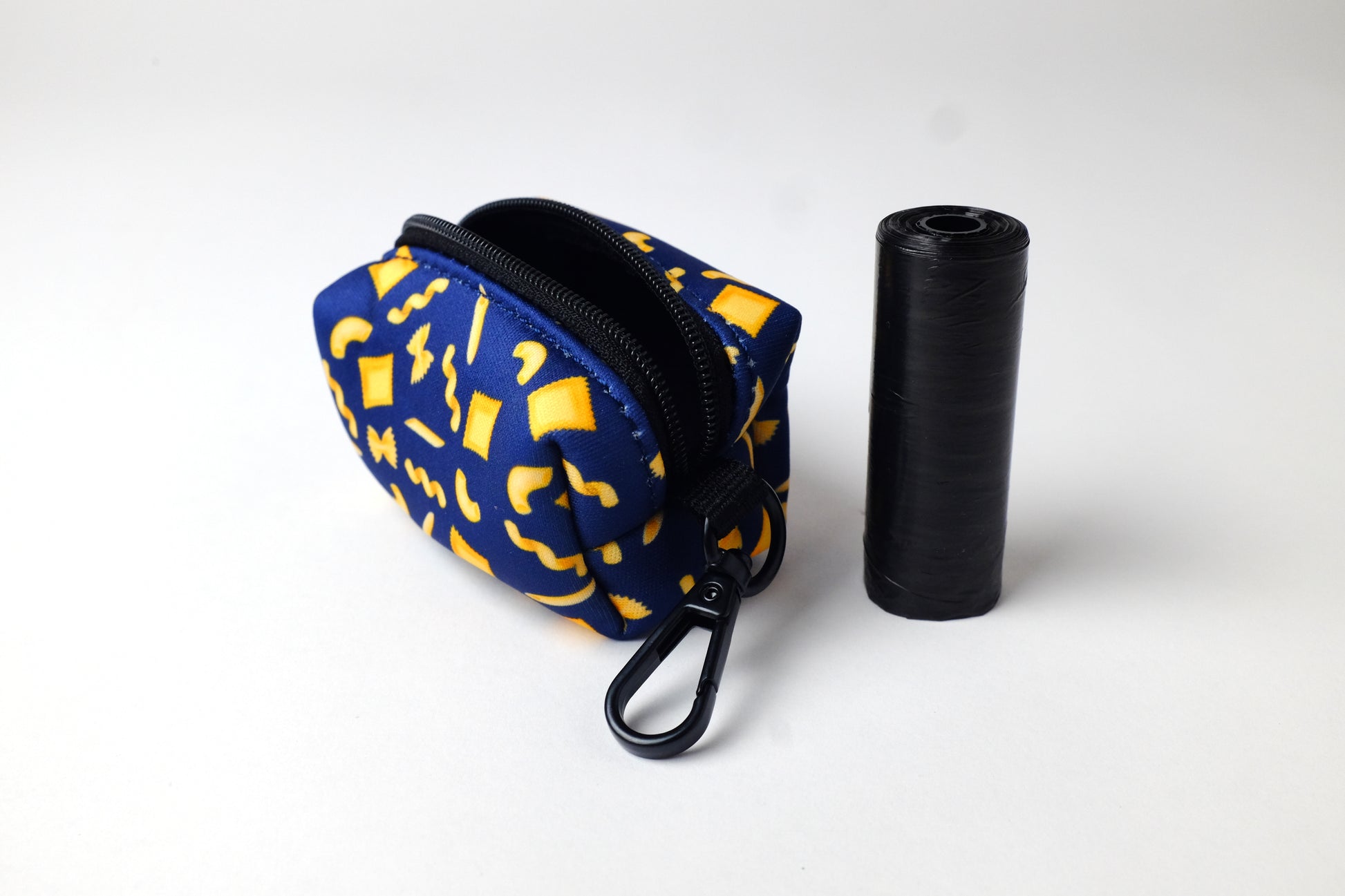 Introducing the Pasta Paws Poop Bag Holder - a stylish and convenient accessory for pasta-loving fans! Made with durable materials, it features a delightful pasta print and a zipper closure for easy access to waste bags as well as a rubber stopper so the bags stay in place. The included metal clip allows for effortless attachment to leashes, belts, or bags. Compact and lightweight, it's perfect for walks or park outings. Get one today and let your pup show off their pasta love in style!